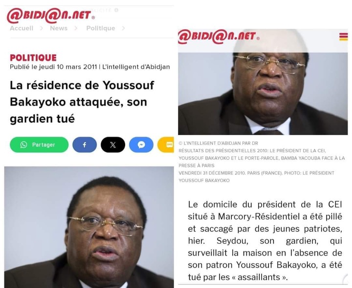 Un soir de mars 2011, la TCI, la télé depuis le Golf Hôtel, fait passer un communiqué urgent dans lequel elle annonce l’assassinat de l’homme de chambre de Youssouf Bakayoko. Des médias, tel qu’on le voit dans l’image illustrative, corroborent l’info. Tous, accusent les patriotes du camp Gbagbo d’avoir pillé le domicile du Président de la CEI et assassiné son domestique.